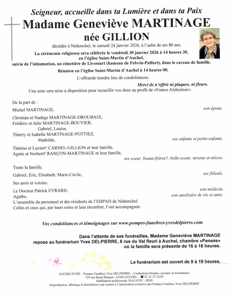 Jean et Jeanne Carlier (Ephad de Nédonchel) et leurs enfants vous présentent leurs sincères condoléances et s’associent à votre peine. Nous pensons bien à vous.
