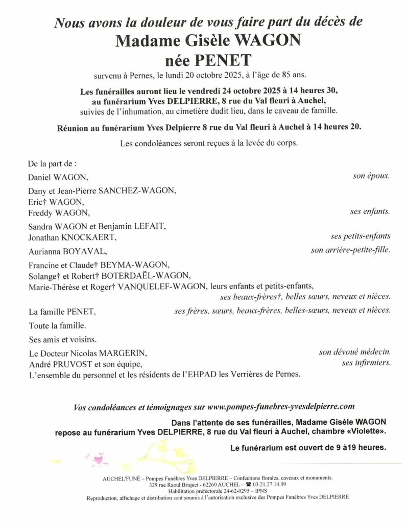 Nous présentons à Daniel et à ses enfants et petits enfants, nos sincères condoléances suite au décès de Gisèle WAGON PENET – sœur de mon père Henri PENET (décédé) – Nous sommes de tout cœur avec vous ! A Vendredi après-midi ! Courage à tous