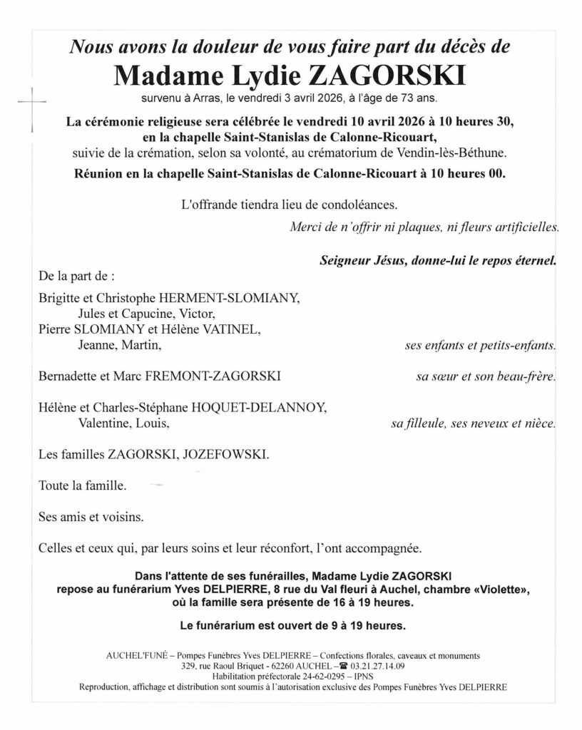 Nous présentons nos sincères condoléances à toute la famille de Madame Zagorski. Nous garderons le souvenir d’une dame très sympathique à l’époque où elle travaillait à la pharmacie Lefebvre à Auchel. Xavier Martine Scribot, Cauchy à la Tour.
