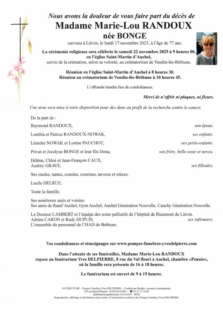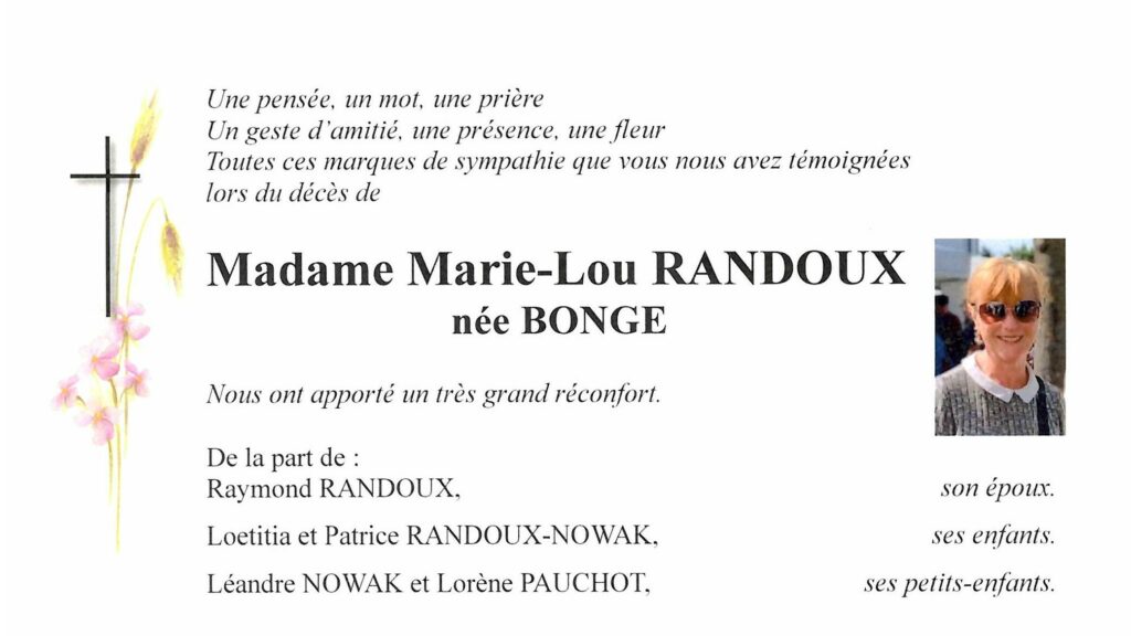 Sincères condoléances et bon courage à la famille. Nous garderons de notre amie de Randauchel le souvenir de sa gaieté et de sa gentillesse.
