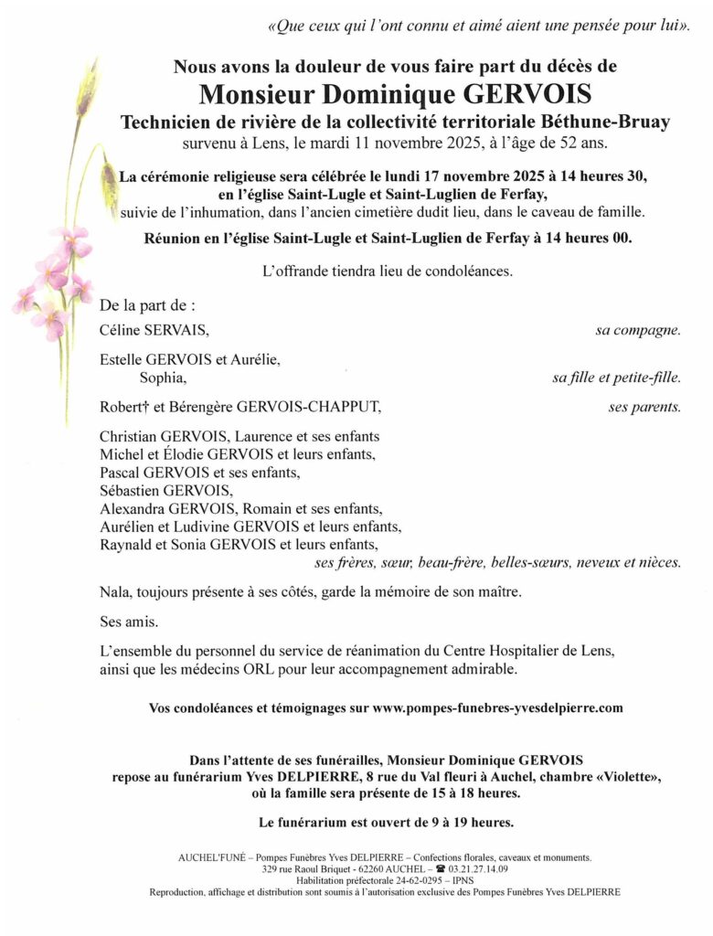 A la famille et aux proches de Dominique Gervois, j’exprime en ces jours douloureux mes très sincères condoléances, et ma profonde sympathie.