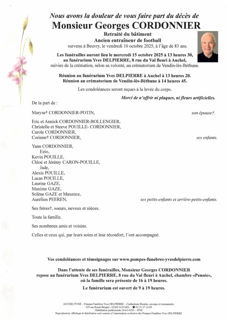 Nous présentons nos sincères condoléances à la famille de Monsieur Cordonnier.